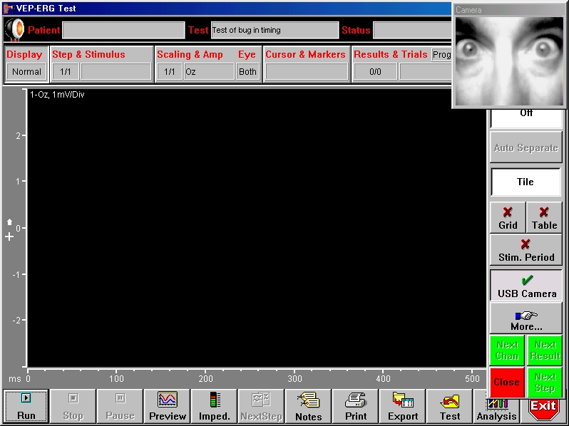 The desktop contains an infrared camera and filter with additional infrared LEDs to illuminate the patient’s eyes even during dark periods. The output of this camera may be viewed directly on the Espion screen via USB and also routed to a video monitor/recorder for real-time display of the patient’s eye movements including blinks.